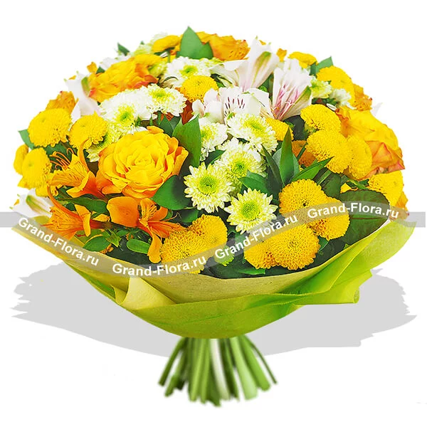 ДЕЛЮКС: роза желтая/оранжевая - 11 шт, хризантема кустовая желтая - 7 шт, альстромерия желтая - 5 шт, альстромерия белая - 4 шт, хризантема кустовая белая - 7 шт, рускус, фетр зеленый.